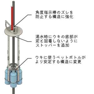 ウキとして使用するペットボトルの固定構造を変更し、視認角度と浮力の安定性を向上。
